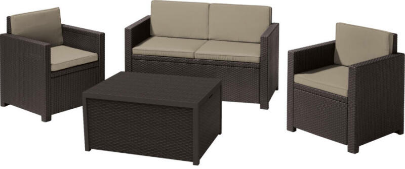 A Monaco egy kényelmes és elegáns bútor szett két fotellel, kanapéval és egy további tároló funkcióval rendelkező négyszögletes asztallal. A bútorok fő előnyei az eredeti rattan szerkezetű felület és a fotelek és kanapé kényelmes ülőrészei. A tartós anyagból készült bútor ellenáll az időjárás viszontagságainak és az UV sugárzásnak. barna-meleg taupeTermék méretei [cm] Fotel( x 2):65 x 63 x 77 szófa:129 x 63 x 77tároló asztal:79 x 59 x 42Csomag mérete [cm]124 x 80 x 59Nettó tömeg [kg]36